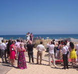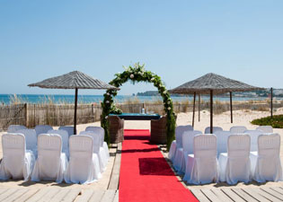 | Duna Beach Club sits directly on the golden sandy beach of Meia Praia beach in Lagos. And this truly beautiful location on the Algarve could mark the start of your married life! Red carpet, a pretty arch and white covered chairs can be set up on the soft sand where your ceremony will take place. It is a perfect way to combine the important moment of exchanging your vows in front of family and friends with a very relaxed and informal setting before enjoying your reception either indoors or out. |